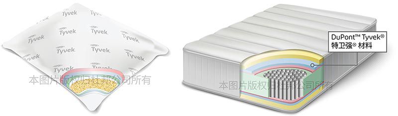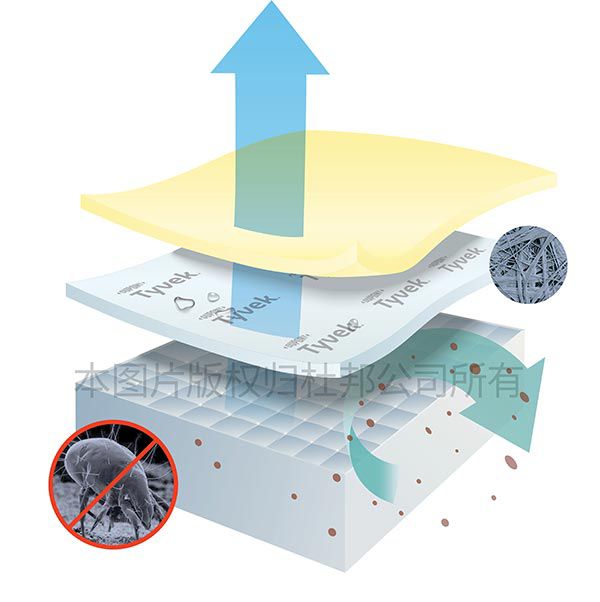 使用Tyvek® 材料可以通过阻隔控制诱发因素,从而有效减缓这些令人困扰的症状。Tyvek® 防螨材料的原理简而言之就是阻隔,通过致密的纤维结构可以使得螨虫无法进入被褥、床褥、床垫的深层。这样,可供螨虫生存的空间将会大大减少,一小部分螨虫也能通过拍打或吸除进行清除,使螨虫浓度远远低于达到危害健康的程度。