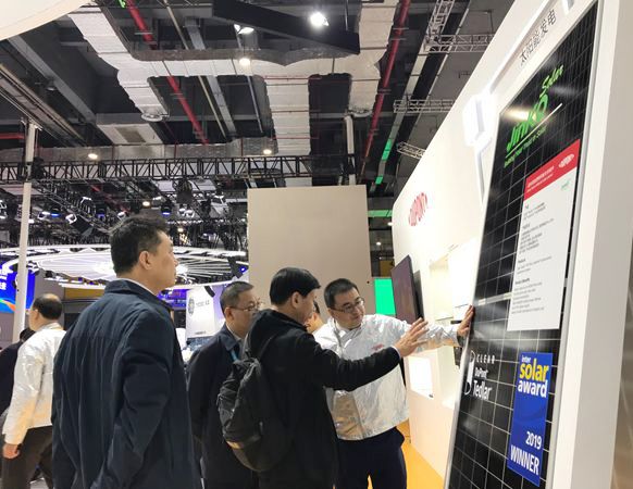 杜邦光伏及氟材料事业部携手全球极具创新力的光伏企业晶科能源,展出晶科透明背板高效双面组件Swan。作为唯一的组件产品,此系列产品荣获2019年Intersolar光伏创新大奖。采用透明背板的双面发电组件,其更轻的重量确保支架结构无需额外加固,相比双玻带边框组件显著降低支架结构和组件安装的相关成本,从而能够有效降低总体系统成本,实现更低的度电成本,更高的投资回报。