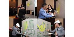 在讲座过程中,三位知名设计师,尝试以创意接力的方式,在特能® 壁纸上创作,作品从刘卫军老师的浪漫卷形花纹,到了曾传杰老师手上变成各种形状的能量符号,最后来到邱春瑞老师的手上,变成了4岁小男孩的足球梦,大师们源源不绝的、各有千秋的创意在特能® 可擦洗壁纸上得到发挥。