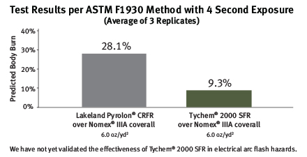 我们对 Tychem® 2000 SFR 进行了专门设计,使其在火焰暴露场景中表现优异。在研发过程中,进行了大量 的ASTM F1930(假人轰燃测试)测试,以优化防护服设计和部件选择。最终成品在火焰暴露测试中持续表现出优异的性能。事实上,在并排测试时,Tychem® 2000 SFR 的预测烧伤率和余焰时间均显著低于竞争产品(包括 Lakeland Pyrolon® CRFR)。选择次级阻燃防护服时,防护服在火焰吞噬条件下的实际性能应作为关键决策依据。根据 ASTM F1930 测试4 秒火焰暴露,均外穿于 Nomex® IIIA 6oz/yd² 防护服条件下,Tychem® 2000 SFR显示 9.3% 体表烧伤率,而 Lakeland Pyrolon® 显示 28.1%。
