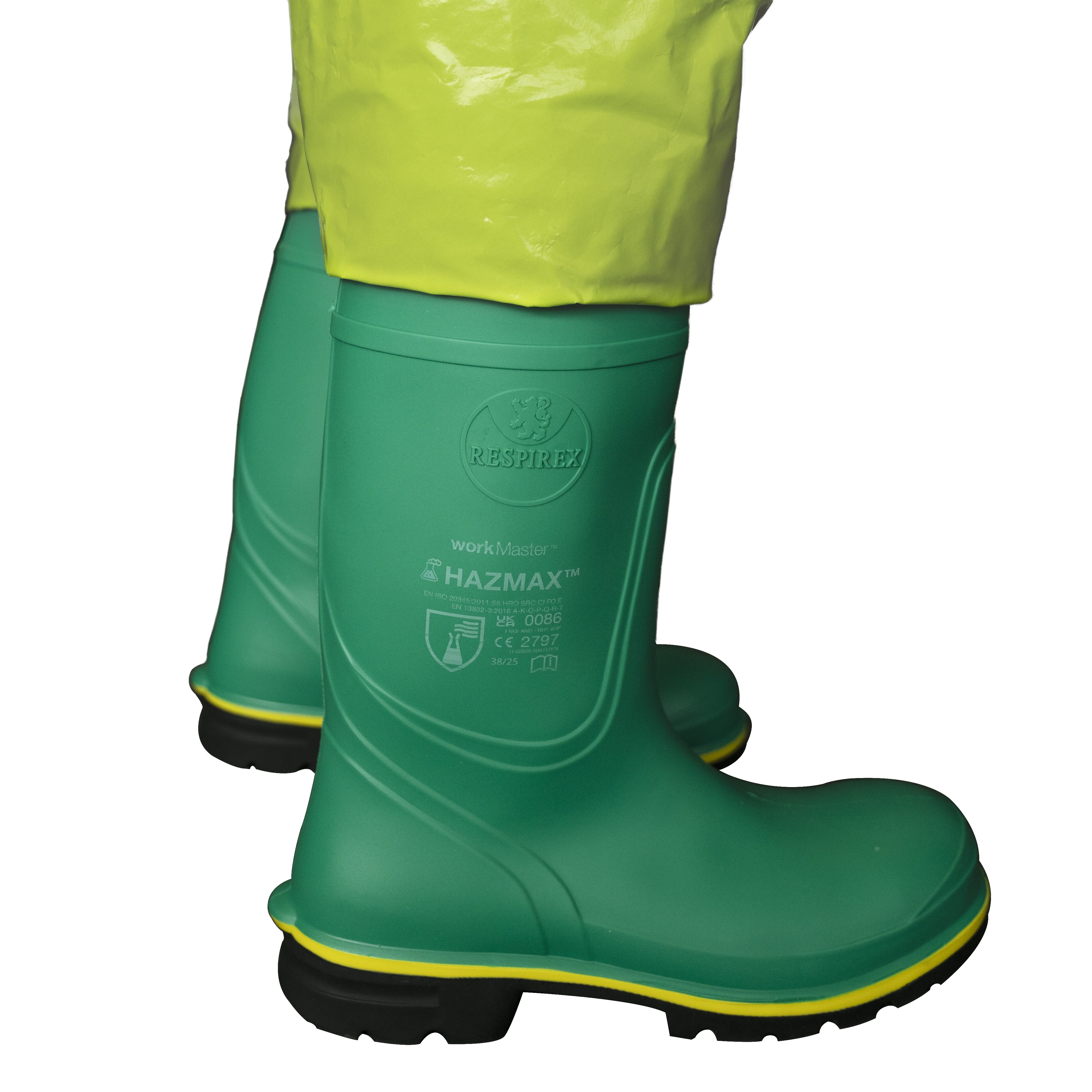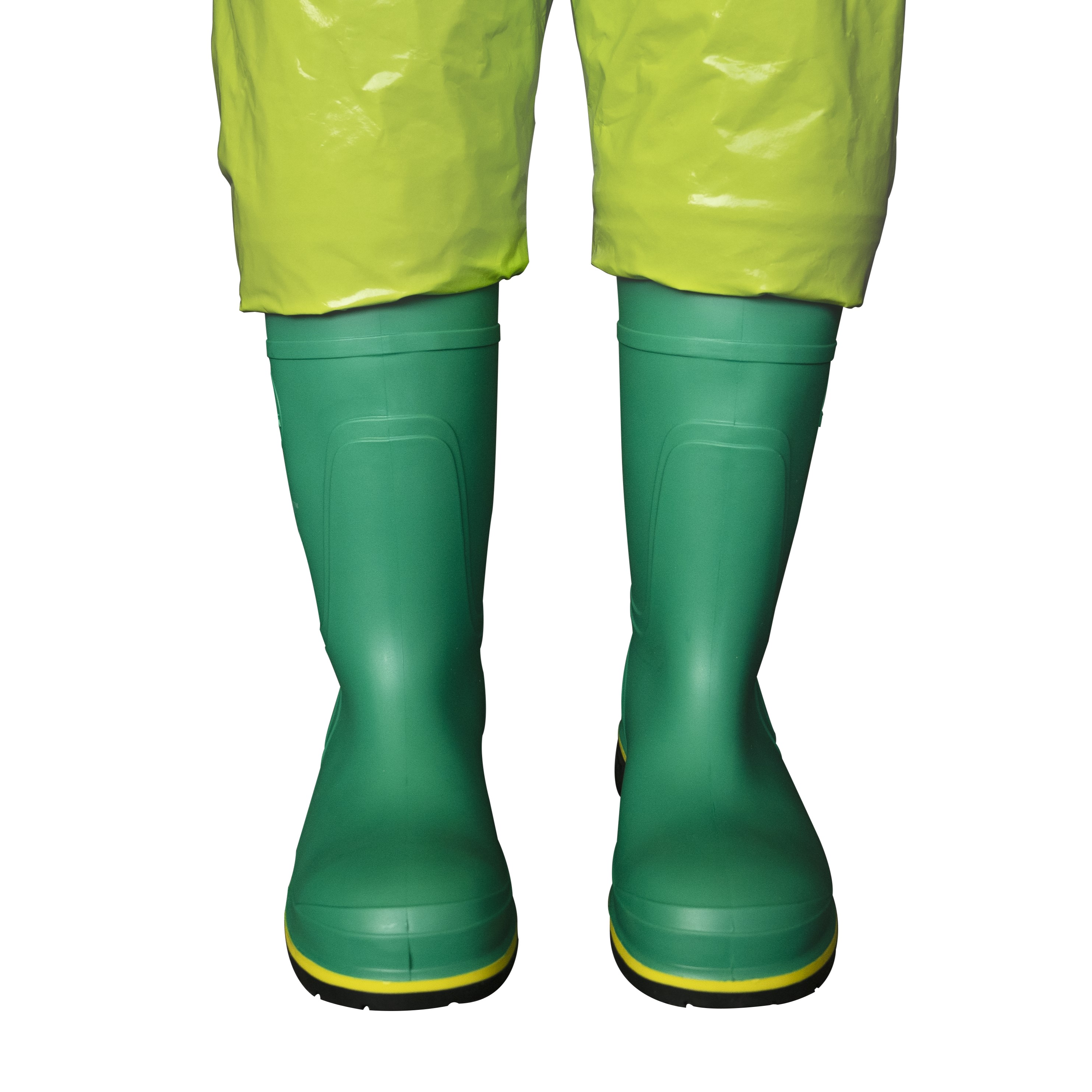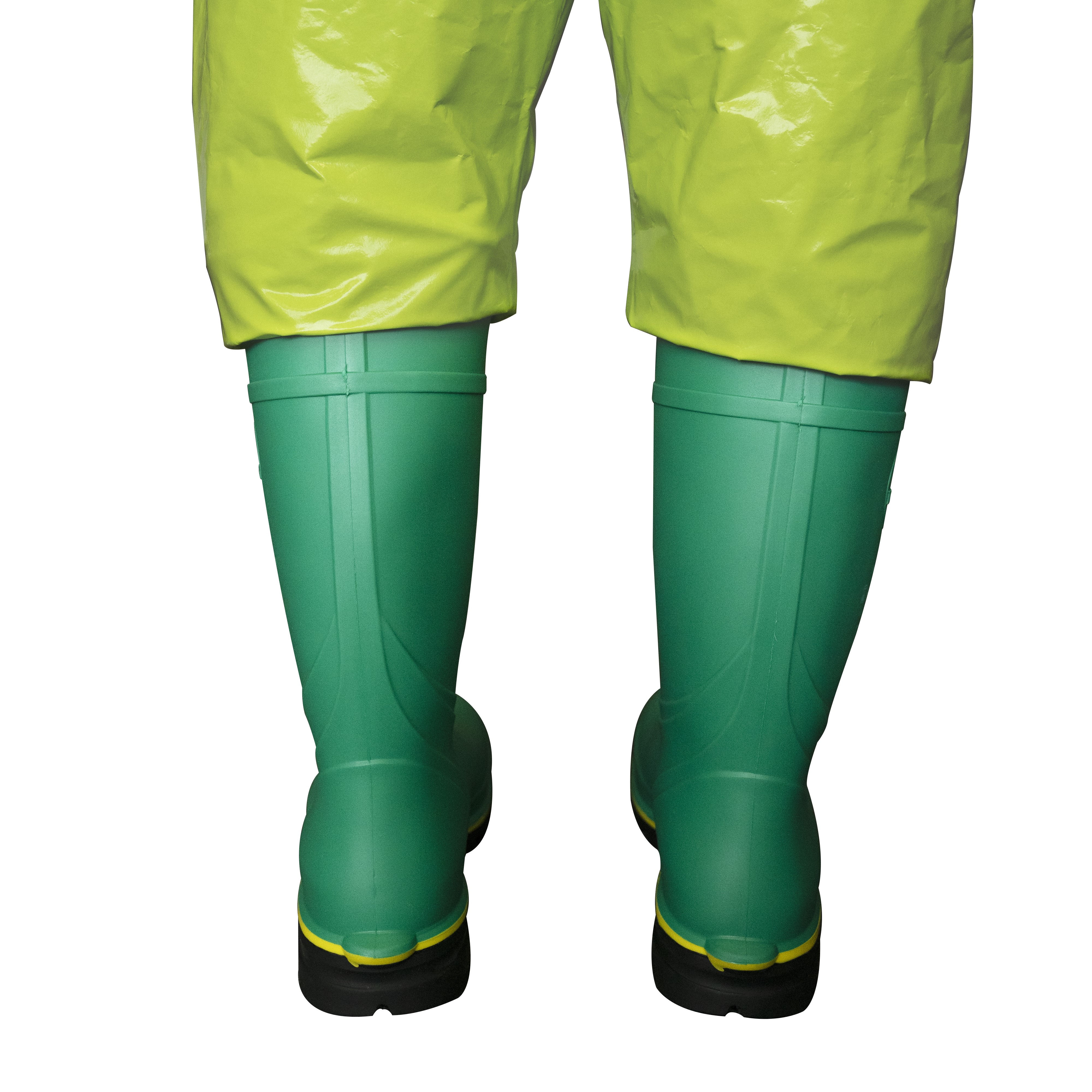 DuPont™Tychem®10000,型号TK0564T LY。全封闭A级防护服,后背突起,前开口。超宽面屏(3层:40mil PVC/5mil Teflon®/20mil PVC)。附带双层手套(内层:多层复合材料;外层:丁基橡胶)。连防化靴。尼龙搭扣式双层门襟。双排气阀。双层贴条。柠檬黄。