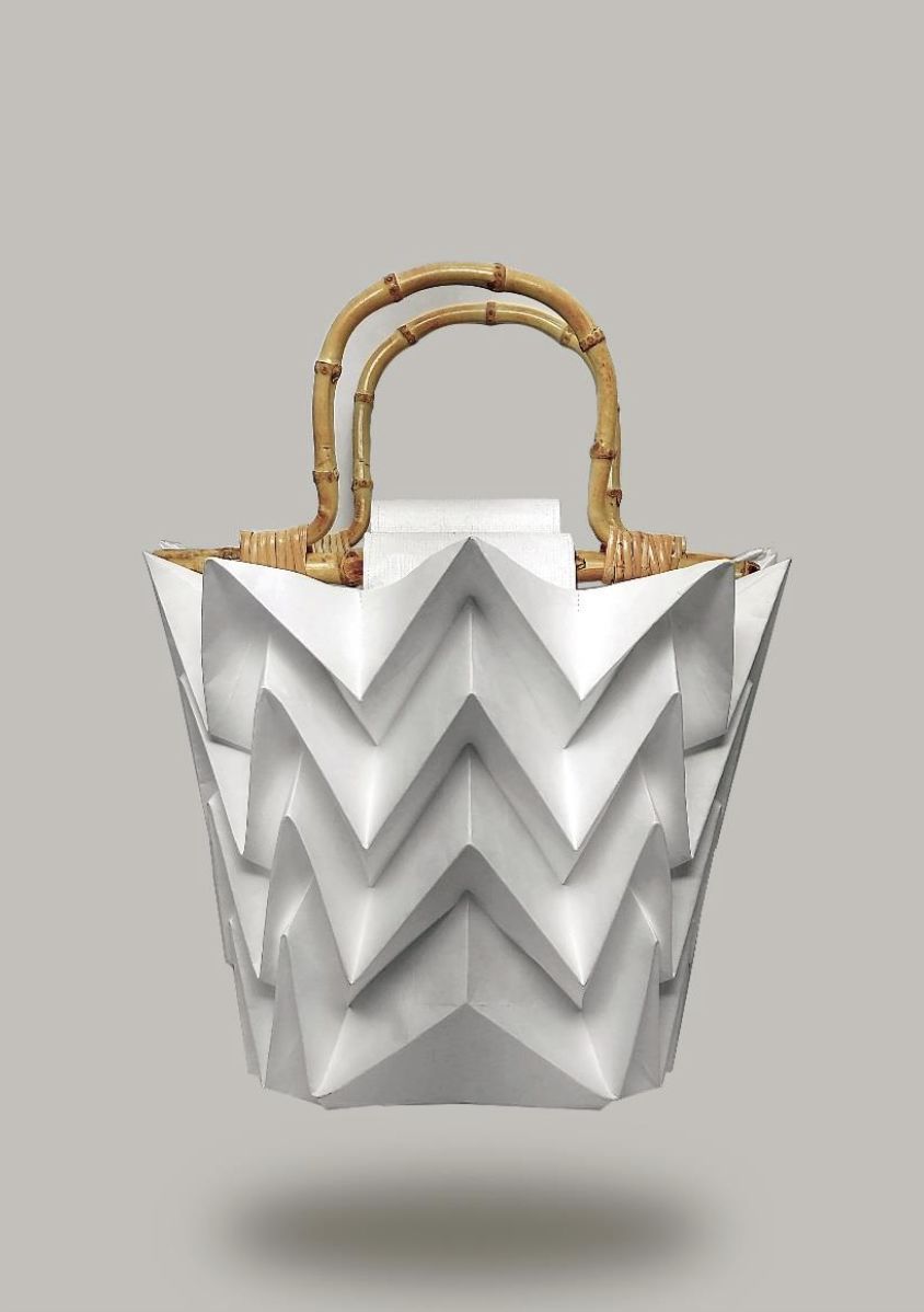 小时候折纸鹤,折好的纸鹤再摊开过后会纸张上反复出现菱形。受此启发设计了这款Tyvek® 材质的包,Tyvek® 类似纸张的质感,折叠过后恰好能表现折纸的感觉。通过热压使折痕处的Tyvek® 发生形变,从而使菱格即使经过长期使用依然存在。