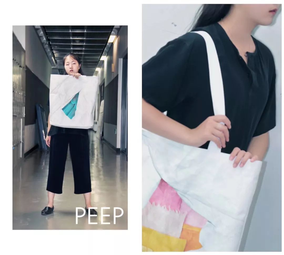 “Peep!”意为偷窥、一督,图形以向内窥探的方式呈现,勾引着人们的好奇心。以Tyvek® 自身作为印花,而非传统的图样或插画,结合其如纸和布一般的质感,印花上的褶皱与Tyvek® 自身的褶皱产生了虚实对比,是对Tyvek® 的一种玩味诠释。