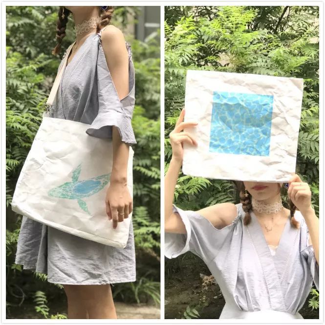 Rhythm(左)通过折叠手法,突出Tyvek® 似纸张的质感,还可增加托特包的容量,而横向穿插的绑带亦可控制包体的开合度,实现Tyvek® 环保与实用的理念。HAZE(右)利用Tyvek® 的轻便、柔韧,及其细腻、哑光、柔软似绸的质感,通过叠加、裁剪、镂空,实现丰富的对比变化。
