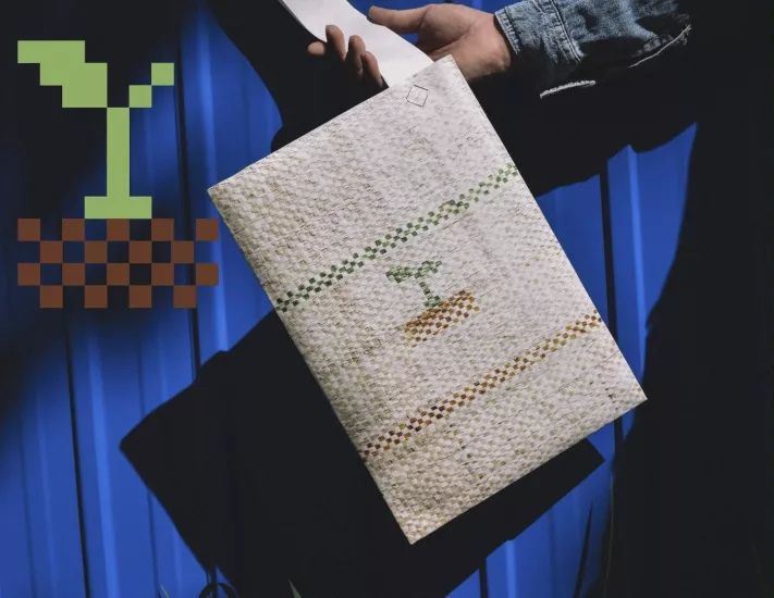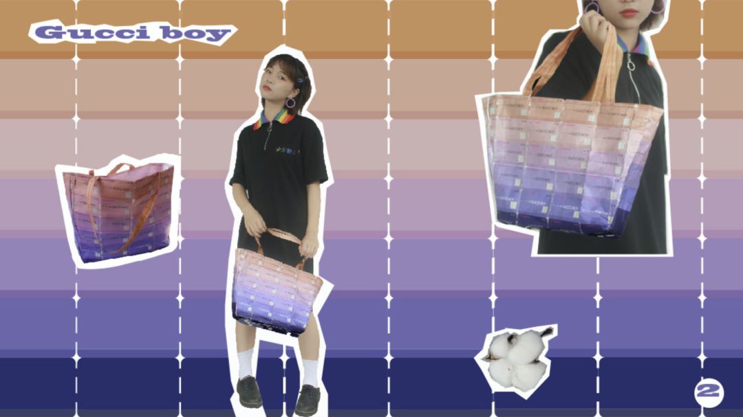 设计主要从编织袋材料质感印制到Tyvek® 材料上的冲突感和矛盾感入手,着重表现了编织袋的纹理与光泽,并从编织造成的格子肌理出发,创造像素风的图样。图样主要以轻松愉快与些许怀旧感为主。