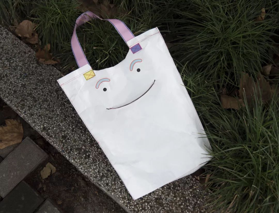 充分利用Tyvek® 防水、轻便的特性,为现代时尚女青年定制的一款周末/日常买菜/买花/逛超市的“花心”包。眉毛可替换,轻松变换每天出街的心情;眼睛镂空,可以将耳机从这里穿进去;舌头是一个透明防水的小内袋;嘴巴黑色线条的两边是隐性软质铁丝,可供收纳。