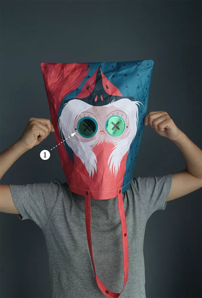 “面具包”系列设计,利用了不同角度展示插图时,产生的观感差异。衍生出“一物两用”的趣味性功能。如上图所示,作为包时,插图是一只白颊红鹤。而作为面具使用时,则变成了红衣白发的小女巫。为了满足作为面具时的视物功能,角色的眼睛部位缝合使用了透明的pvc材质圆片。
