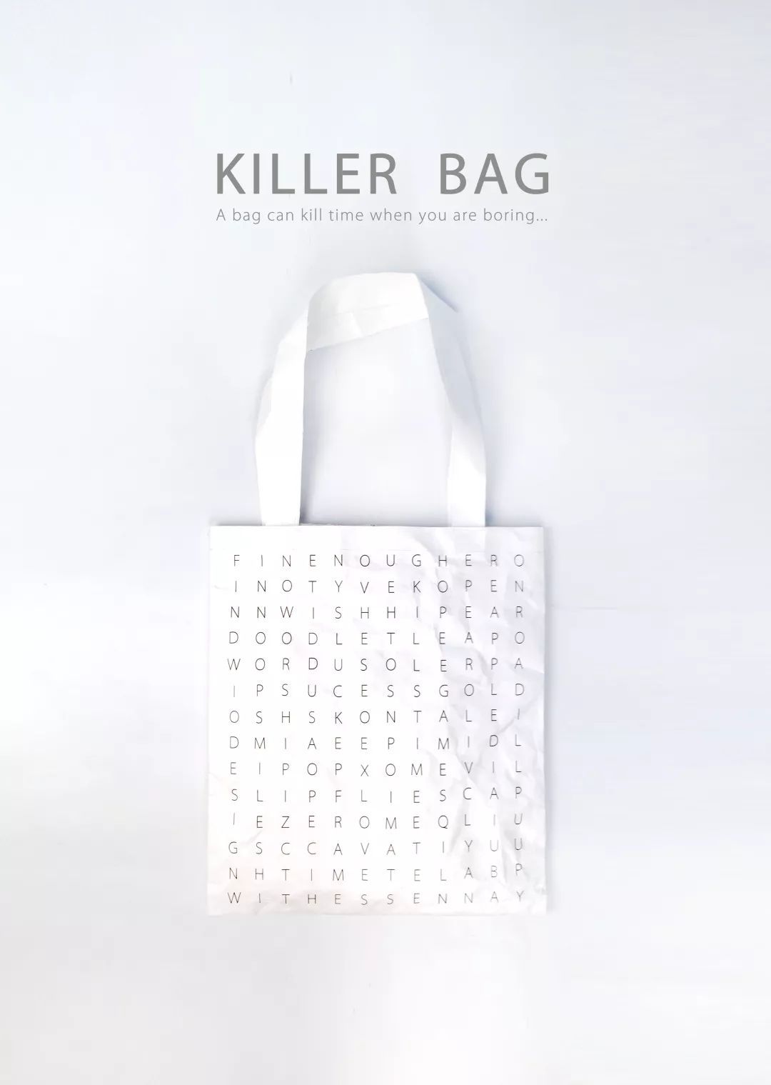 该设计中出现的字母不同于很多品牌反复重复其名称的做法,有着其独特的功能性。它可以用来无聊的时候在无序的字母中寻找一些词来打发时间,即Kill Time,故给这款包命名为"Killer Bag"。