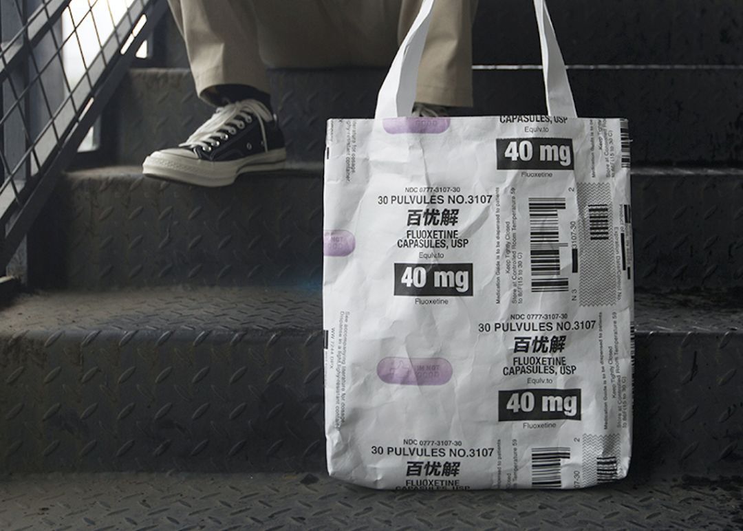 百忧解是一种抗抑郁的药物,设计师从网络“丧文化”提取关键信息,印刻在药丸图案上,表现年轻人对现实生活的一种自嘲态度。