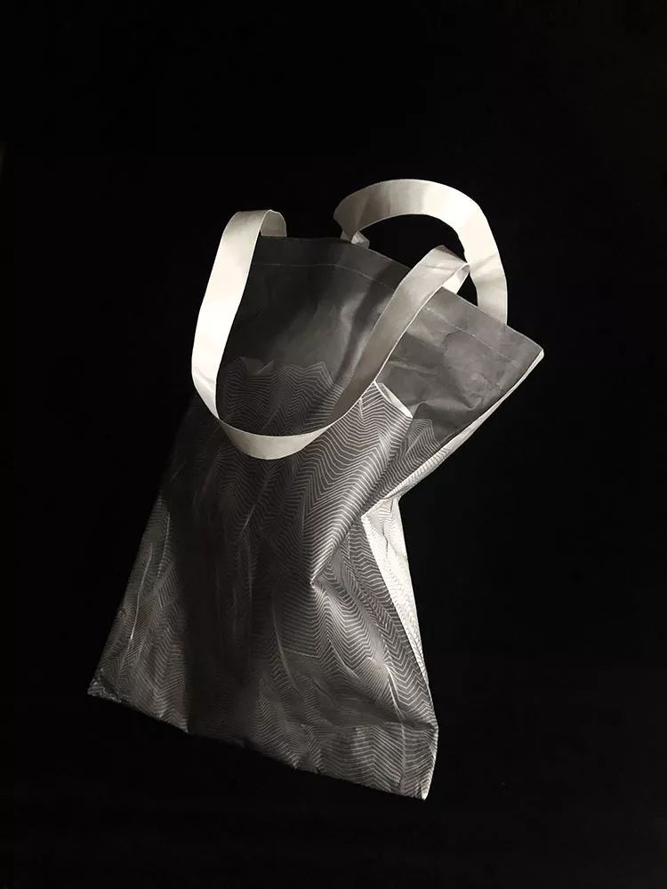 幻触系列(上)作品的设计概念与Tyvek® 材料特性保持一致,追求在视觉内涵上给予消费者多重质感体验与冲击;迷途系列(下)则关注托特包的使用情境,将图案与迷宫结合,以线铺垫,双层Tyvek® 粘合制成立体图案迷宫,开拓用户可参与的有趣的互动形式。